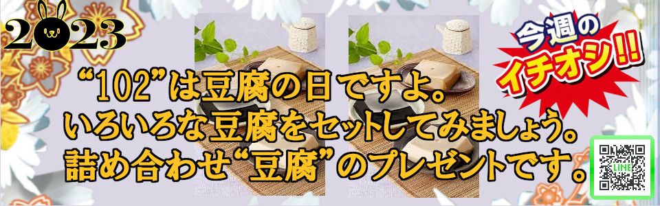 10月1日【日】〜10月7日【土】 ★毎週日曜日更新★毎週季節感を味わえるプレゼントを予定しています。こちらのコーナーから[ご予約]頂いたお客様にプレゼント。(プレゼントは〆切翌週のお渡しとなります)片手間に時々覗いて見て下さいね。★イチオシ-第92回★10月1日(日)~10月7日(土) “102”は豆腐の日ですよ。いろいろな豆腐をセットしてみましょう。詰め合わせ“豆腐”のプレゼントです。奮ってご参加下さい。★他の企画と併用できませんのでご注意下さい★