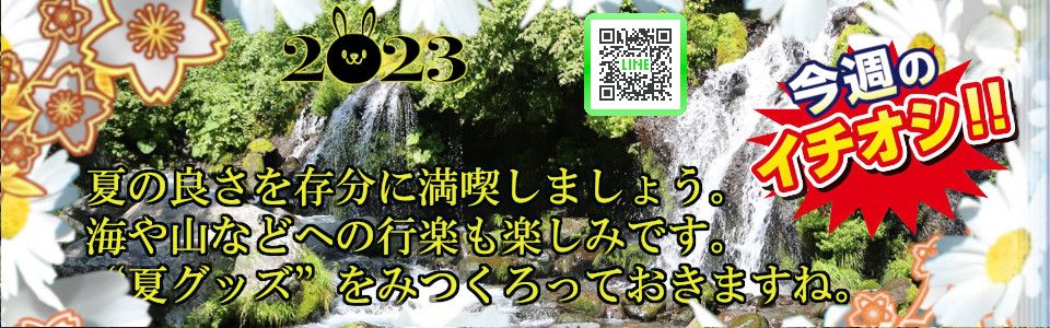 8月6日【日】〜8月12日【土】 ★毎週日曜日更新★毎週季節感味わうプレゼント予定してます。こちらコーナー予約]頂いたお客様プレゼント。(プレゼントは〆切翌週のお渡しとなります)片手間に時々覗いて見て下さいね。★イチオシ-第84回★8月6日(日)~8月12日(土)夏の良さを存分に満喫しましょう。海や山などへの行楽も楽しみです。“夏グッズ”をみつくろっておきますね。奮ってご参加下さい。★他の企画と併用できませんのでご注意下さい★