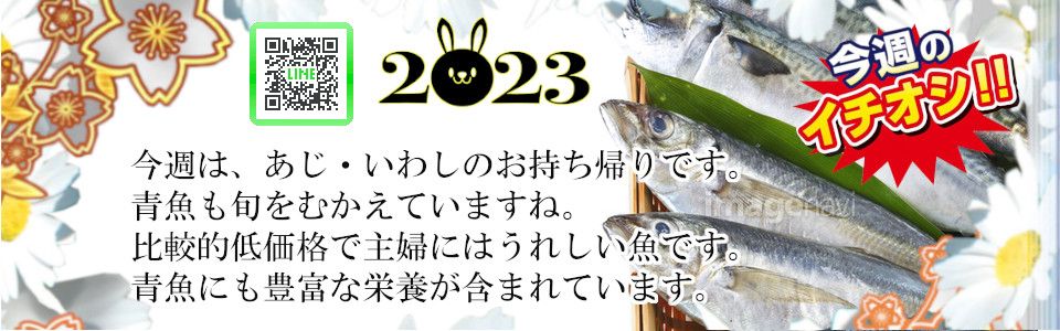 7月23日【日】〜7月29日【土】 ★毎週日曜日更新★毎週季節感味わうプレゼントを予定。このコーナーから予約]頂いたお客様プレゼント。(プレゼントは〆切翌週のお渡しとなります)片手間に時々覗いて見て下さいね。★イチオシ-第82回★7月23日(日)~7月29日(土)今週は、あじ・いわしのお持ち帰りです。青魚も旬をむかえています。比較的低価格で主婦には嬉しい魚です。青魚にも豊富な栄養が含まれています。奮ってご参加下さい。★他の企画と併用できませんのでご注意下さい★